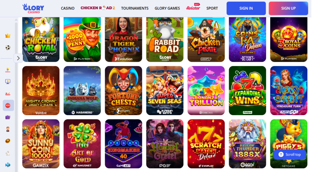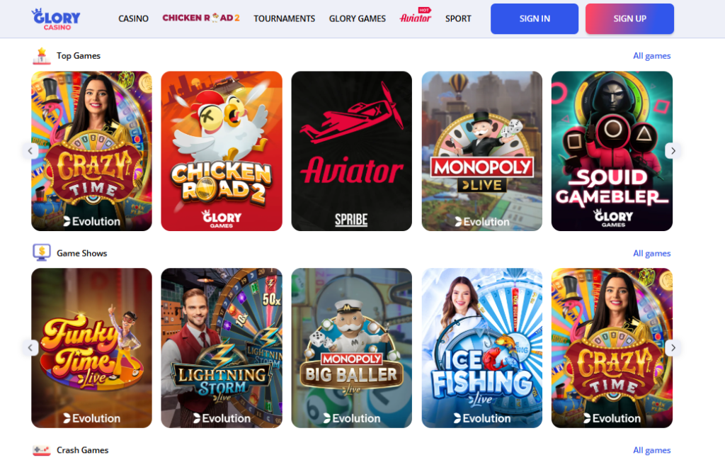 At Glory Casino, you’ll find a large game collection and a simple search system. Everything is neatly organized into categories — Slots, Top games, Game shows, Crash games, Table games, Arcade, Lottery, Keno, and more. Even beginners can easily choose a game that suits their interests on their very first visit. For convenience, there is also a quick search by game title or provider.